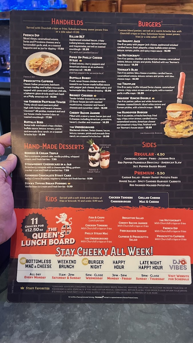 Two 4 oz patties, cheddar and American cheeses, caramelized onions, lettuce, tomato and pickle, finished with our Yeoman’s house sauce